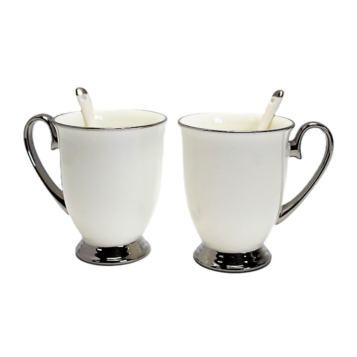 Tazas blancas 2pc Mangos cromados, cucharillas, Porcelana, Elegante, Reina Isabel