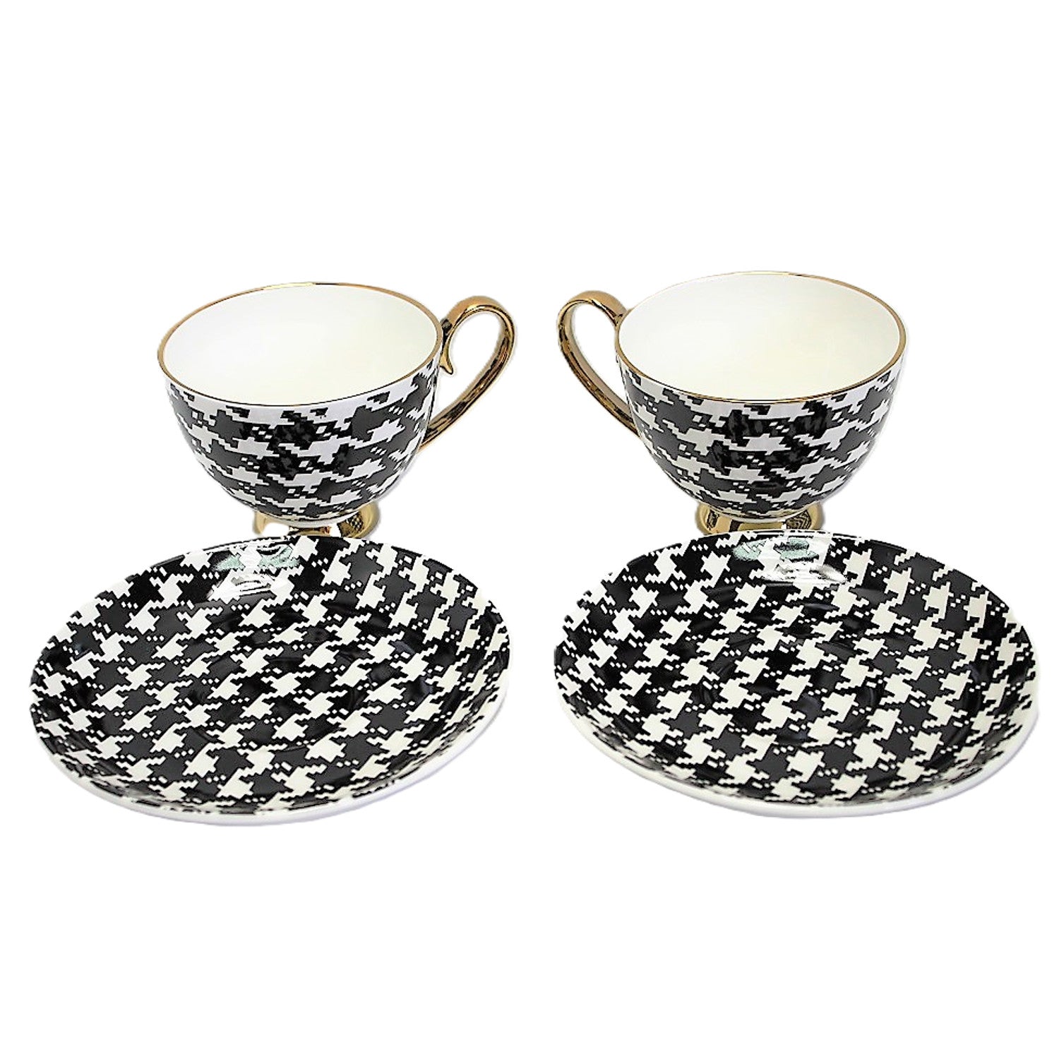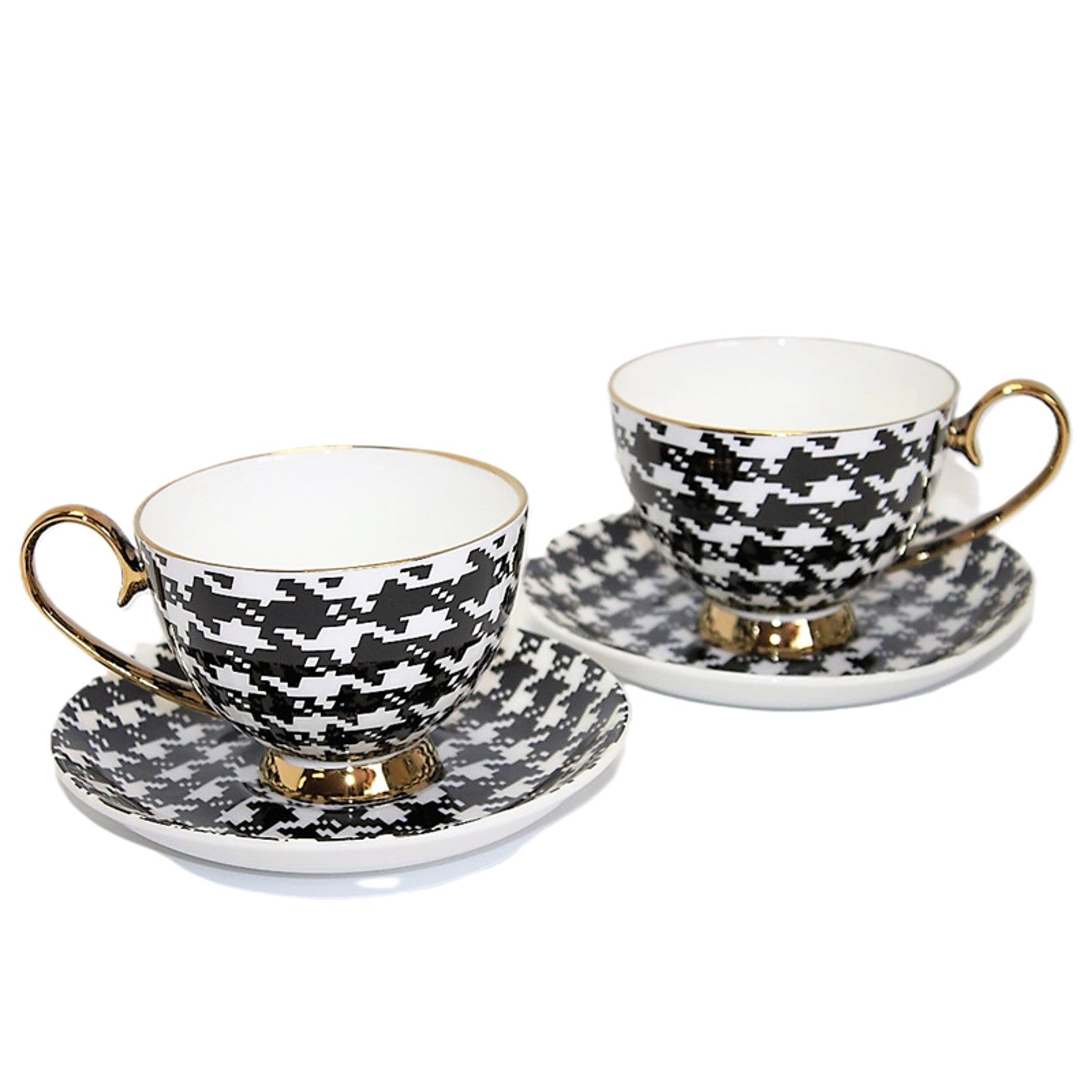 Cada taza y plato de este juego ha sido cuidadosamente elaborado en porcelana de la más alta calidad, garantizando durabilidad y elegancia. Las pepitas blancas y negras añaden un toque único, acentuado con bordes y asas dorados que aportan un toque de glamour y prestigio.