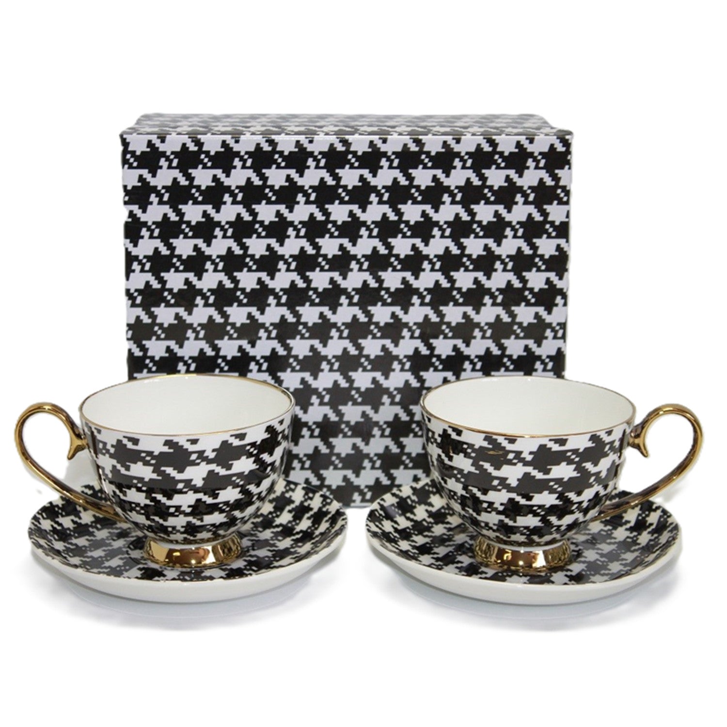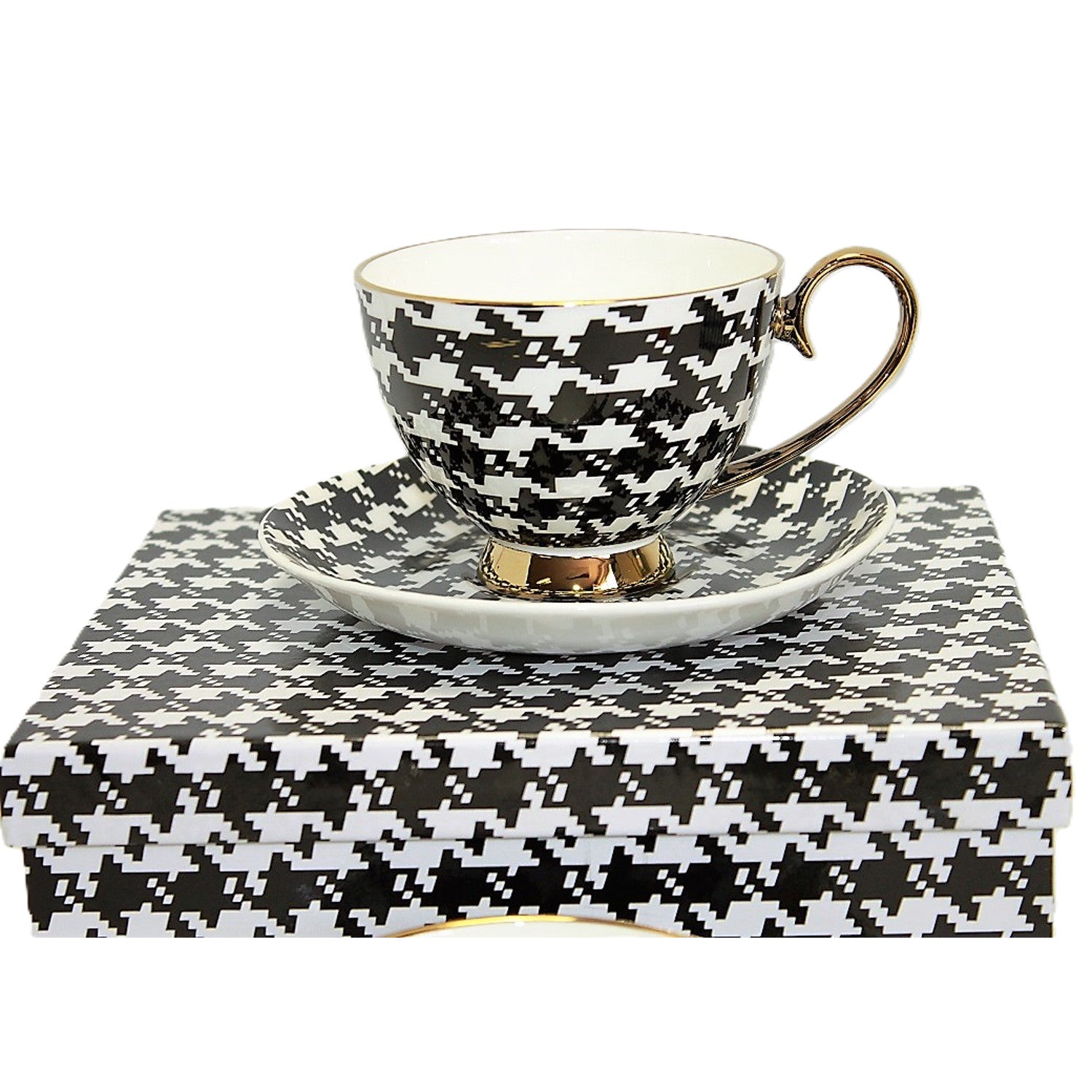El juego de tazas Queen Isabell en pepita blanca y negra con accesorios dorados no sólo destaca por su estética y calidad, sino que además se presenta en un embalaje único. Esta elegante caja con motivos de pepita es ideal para regalo. Cada pieza ha sido cuidadosamente pensada para crear una presentación inolvidable que seguro encantará a quien la reciba.