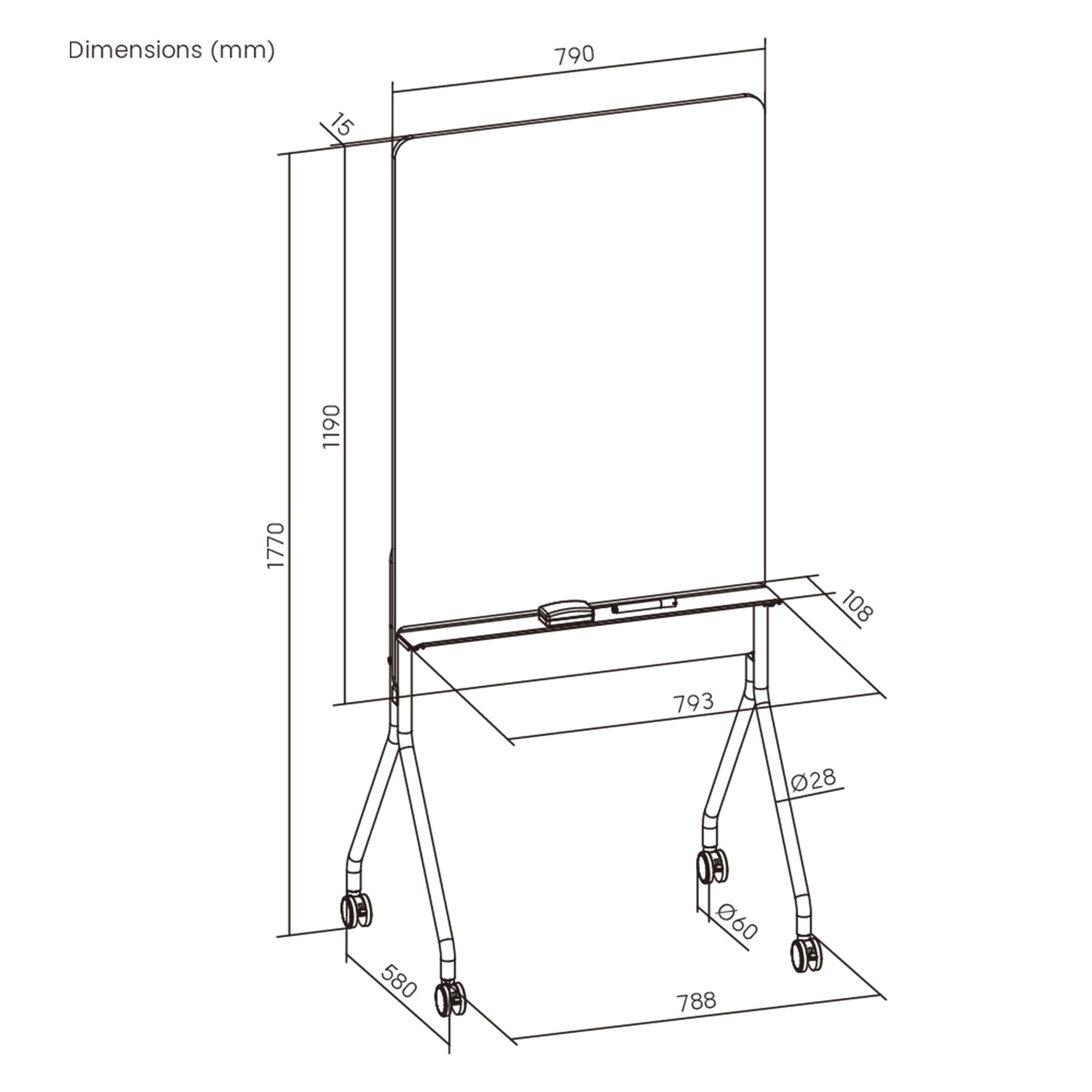 La superficie de la pizarra blanca de 119x79 cm ofrece espacio suficiente para notas, bocetos o dibujos sin ocupar demasiado espacio. Es el tamaño óptimo para adaptarse tanto a la sala de juntas como a la oficina doméstica.