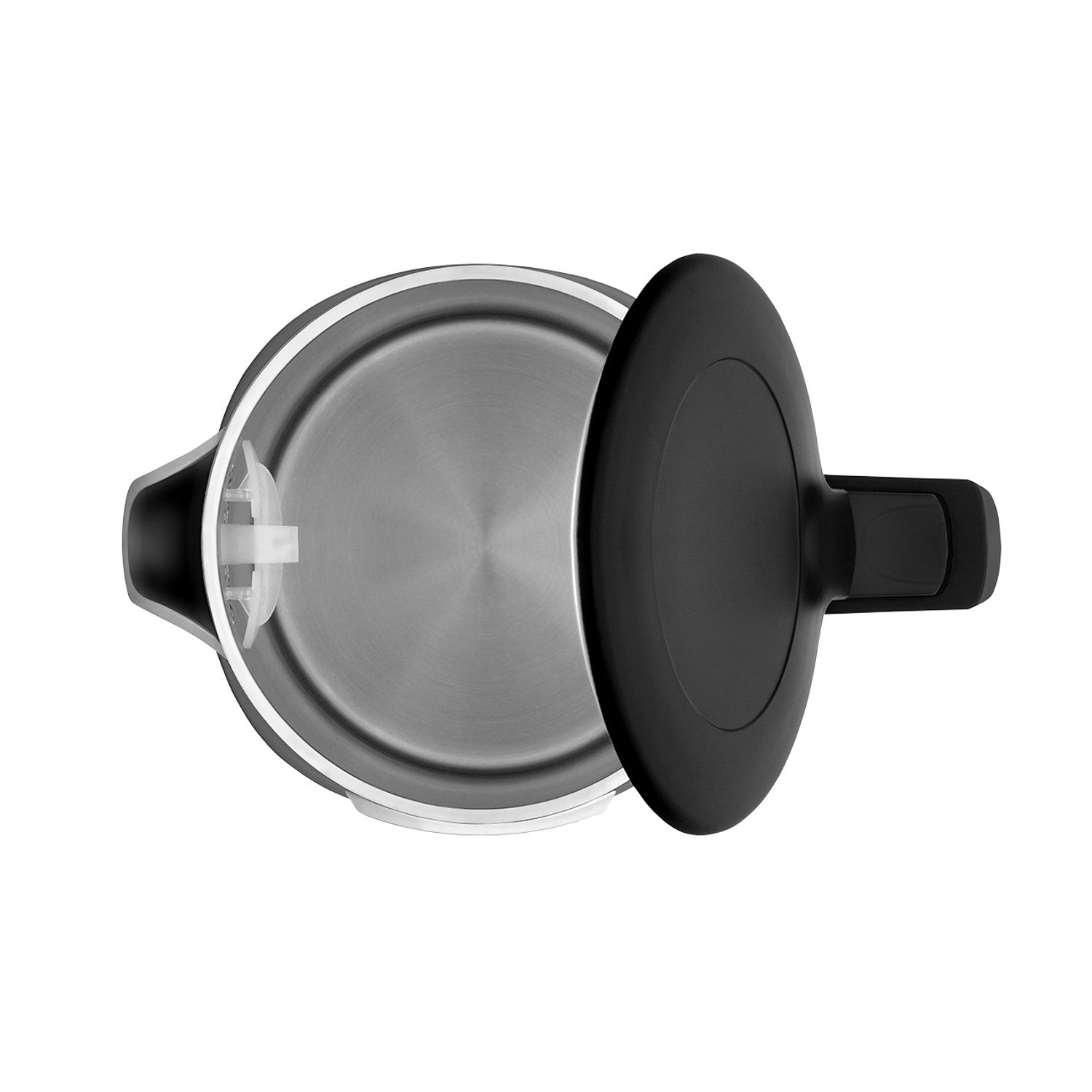 El hervidor está equipado con un práctico botón para abrir la tapa con un solo toque, lo que facilita mucho el llenado de agua. El fondo liso con elemento calefactor oculto minimiza la acumulación de cal y suciedad. La base totalmente giratoria permite colocar el hervidor cómodamente en cualquier lado, a la vez que proporciona un lugar para guardar el cable sobrante, manteniendo la encimera de la cocina despejada y ordenada.