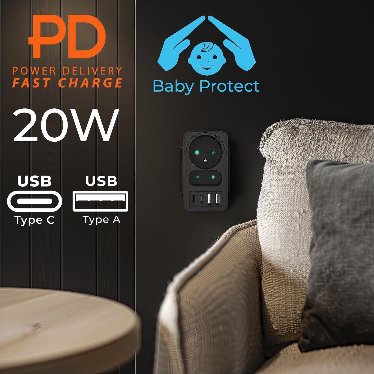 Los dos puertos USB tipo A integrados con hasta 3 A (máx. 18 W) son perfectos para cargar accesorios como auriculares inalámbricos, powerbanks, altavoces Bluetooth o brazaletes deportivos. Y los dos puertos USB de tipo C con tecnología Power Delivery (máx. 20 W) garantizan una carga rápida y estable de los dispositivos modernos: smartphones, tabletas, consolas portátiles y otros dispositivos compatibles con el estándar Power Delivery. Con esta combinación, se pueden alimentar simultáneamente varios dispositivos con distintas necesidades de energía, sin necesidad de cargadores adicionales.