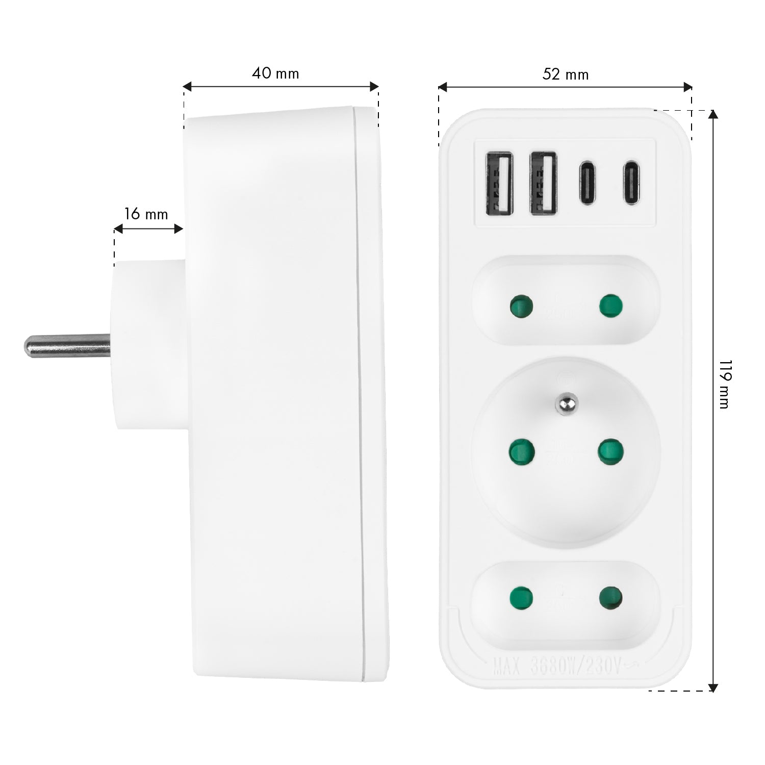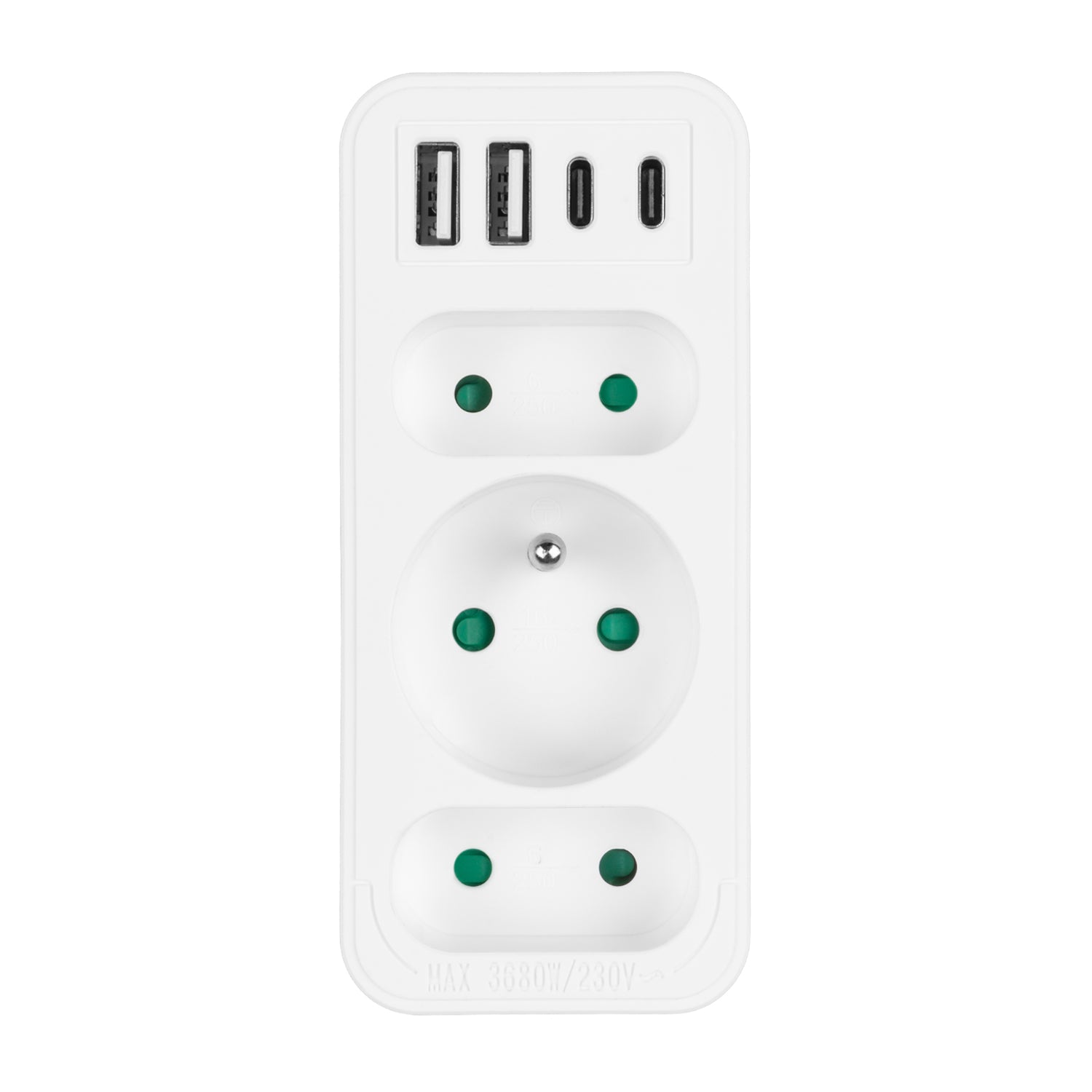 - Carga máxima de 3680 W para un funcionamiento estable y seguro incluso con varios dispositivos al mismo tiempo