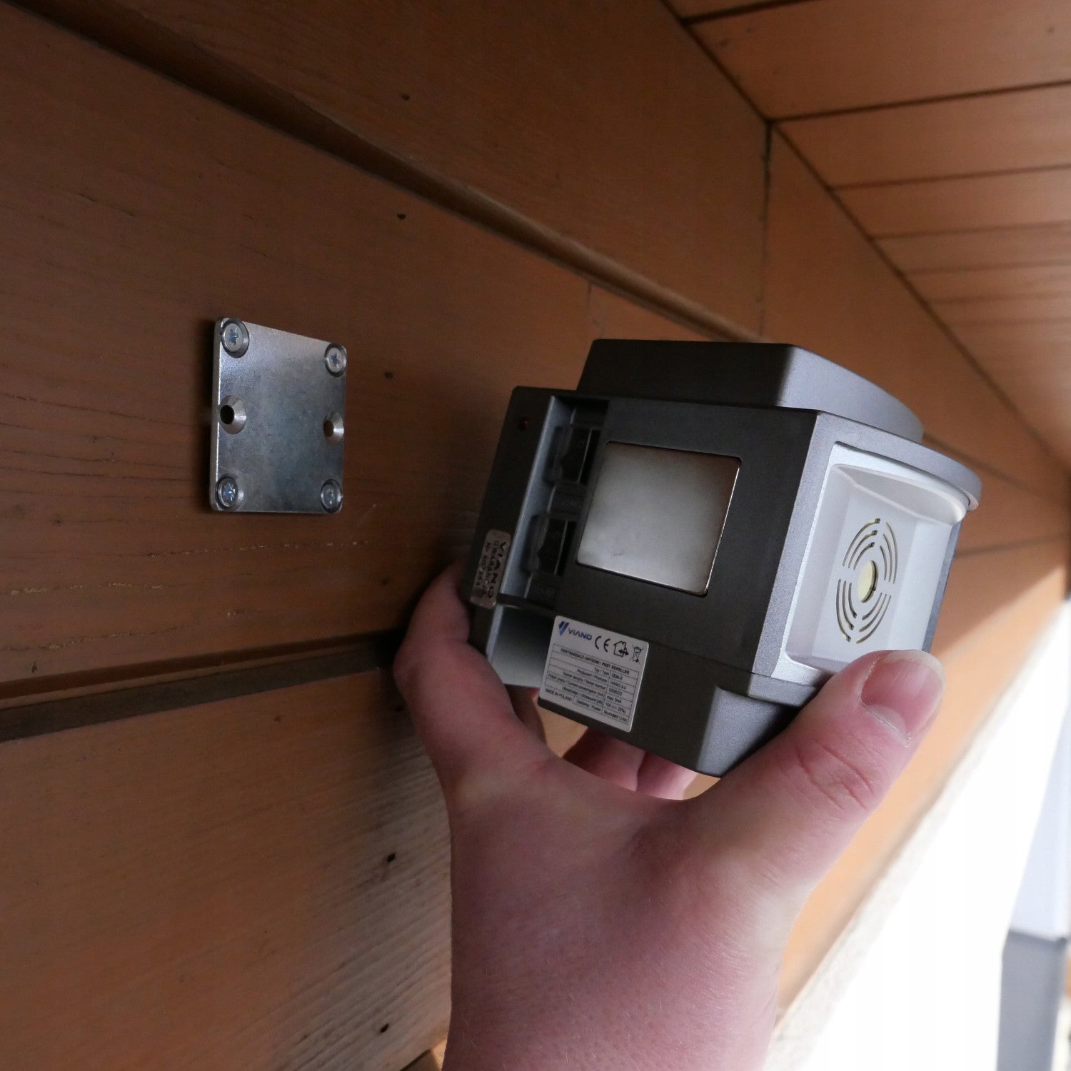 Además, se incluye una placa metálica con orificios que se puede atornillar a cualquier superficie con los tornillos suministrados y a la que se puede fijar el repelente. De este modo, el dispositivo puede fijarse a tableros frontales, pilares de madera, pérgolas de madera, etc.