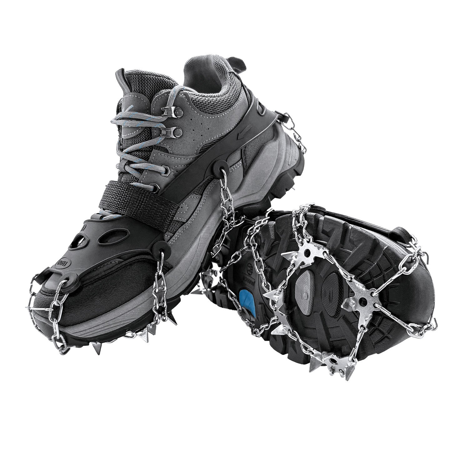 Los crampones están equipados con 19 clavos de acero de 14 mm de altura, lo que garantiza un excelente agarre en superficies resbaladizas. Los clavos y las cadenas están fabricados en acero inoxidable, lo que garantiza su resistencia a la corrosión y su durabilidad. La banda de silicona es elástica y se adapta a diferentes tamaños de calzado, lo que garantiza la estabilidad y la comodidad.