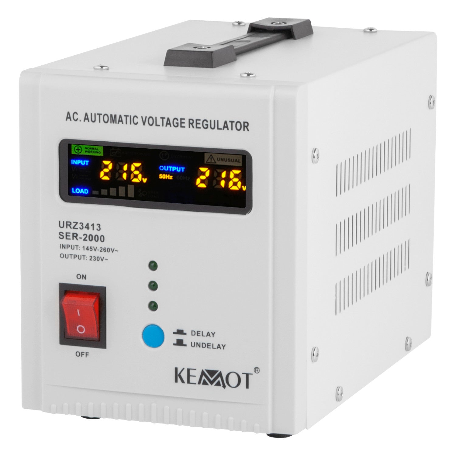 Si necesita un estabilizador de tensión para dispositivos con una gran corriente de irrupción instantánea, elija un modelo equipado con la función DELAY ON. El KEMOT SER-2000, está equipado con un botón de retardo de conexión DELAY en el rango de 6 a 180 segundos, que reducirá el riesgo de dañarlo cuando los dispositivos conectados a él tengan una gran corriente de irrupción instantánea. Además, el estabilizador SER-2000 dispone de protección contra sobretensión y subtensión, sobrecarga, sobrecalentamiento y cortocircuito.