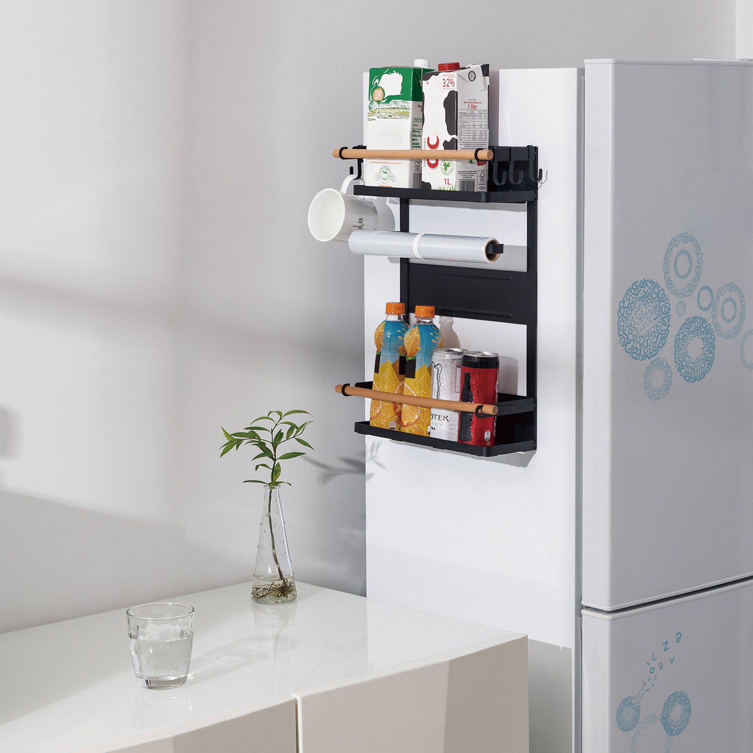Gracias al montaje magnético en, por ejemplo, la pared del frigorífico, los productos y accesorios colocados en la estantería estarán siempre a mano.