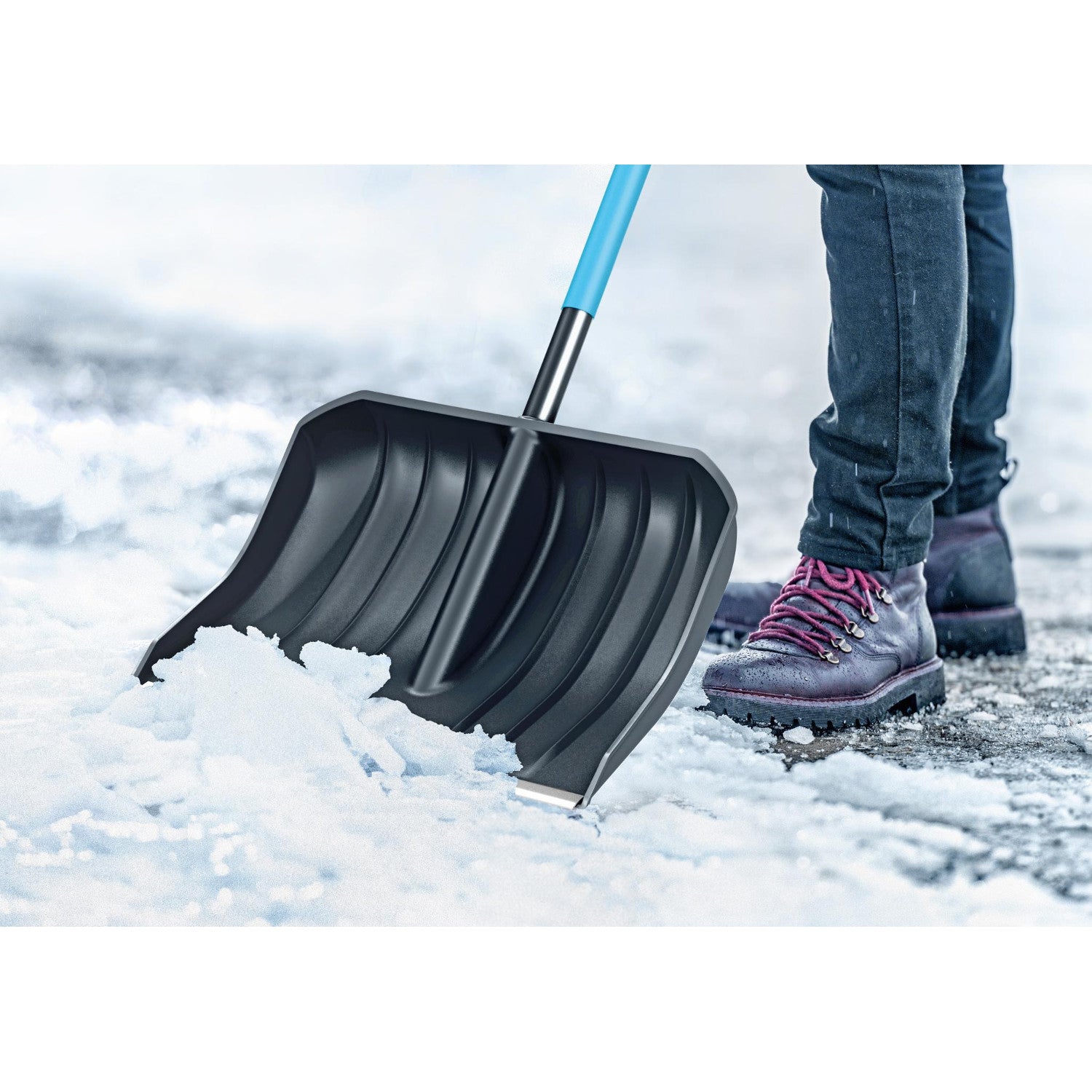 - Cabeza con una profundidad de 150 mm permite transportar grandes cantidades de nieve, y su borde acabado con una banda de aluminio aumenta la resistencia de la pala a los daños causados por golpes contra piedras o trozos duros de nieve y hielo
