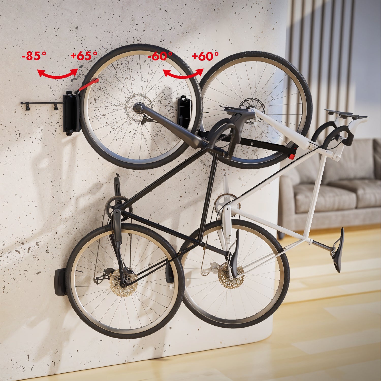 Para colgar la bicicleta, basta con pasar la llanta de la rueda delantera por el gancho del soporte. De este modo, la bicicleta queda sujeta por la rueda, lo que minimiza el riesgo de dañar el cuadro u otras partes de la bicicleta. El soporte garantiza estabilidad y seguridad, manteniendo la bicicleta en posición vertical. Una vez colgada la bicicleta, el soporte se puede girar 65 grados hacia la izquierda o hacia la derecha, lo que permite guardar la bicicleta más cerca de la pared. El gancho está recubierto de goma para proteger la llanta de la bicicleta contra arañazos.
