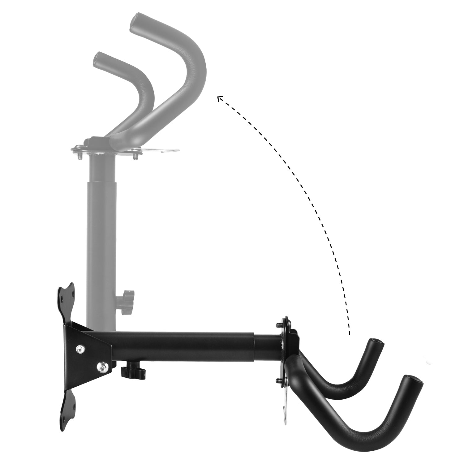 Los ganchos están recubiertos de una capa protectora que evita que la bicicleta se raye. La posibilidad de ajustar la distancia respecto a la pared permite adaptar la longitud del soporte a tus necesidades. Además, el soporte cuenta con un gancho para colgar el casco.