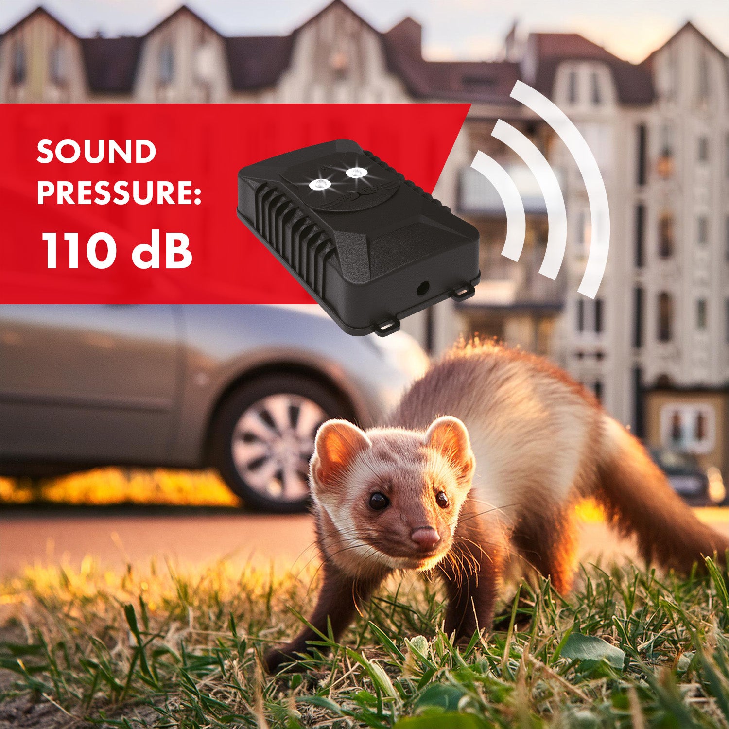 El ultrasonido de frecuencia variable de 18-36 kHz es inofensivo para perros, gatos y otros animales domésticos, al tiempo que repele eficazmente roedores y martas. El repelente puede alimentarse directamente de la batería del coche, a pilas, y el cable USB incluido también permite alimentar el dispositivo de la red eléctrica.
