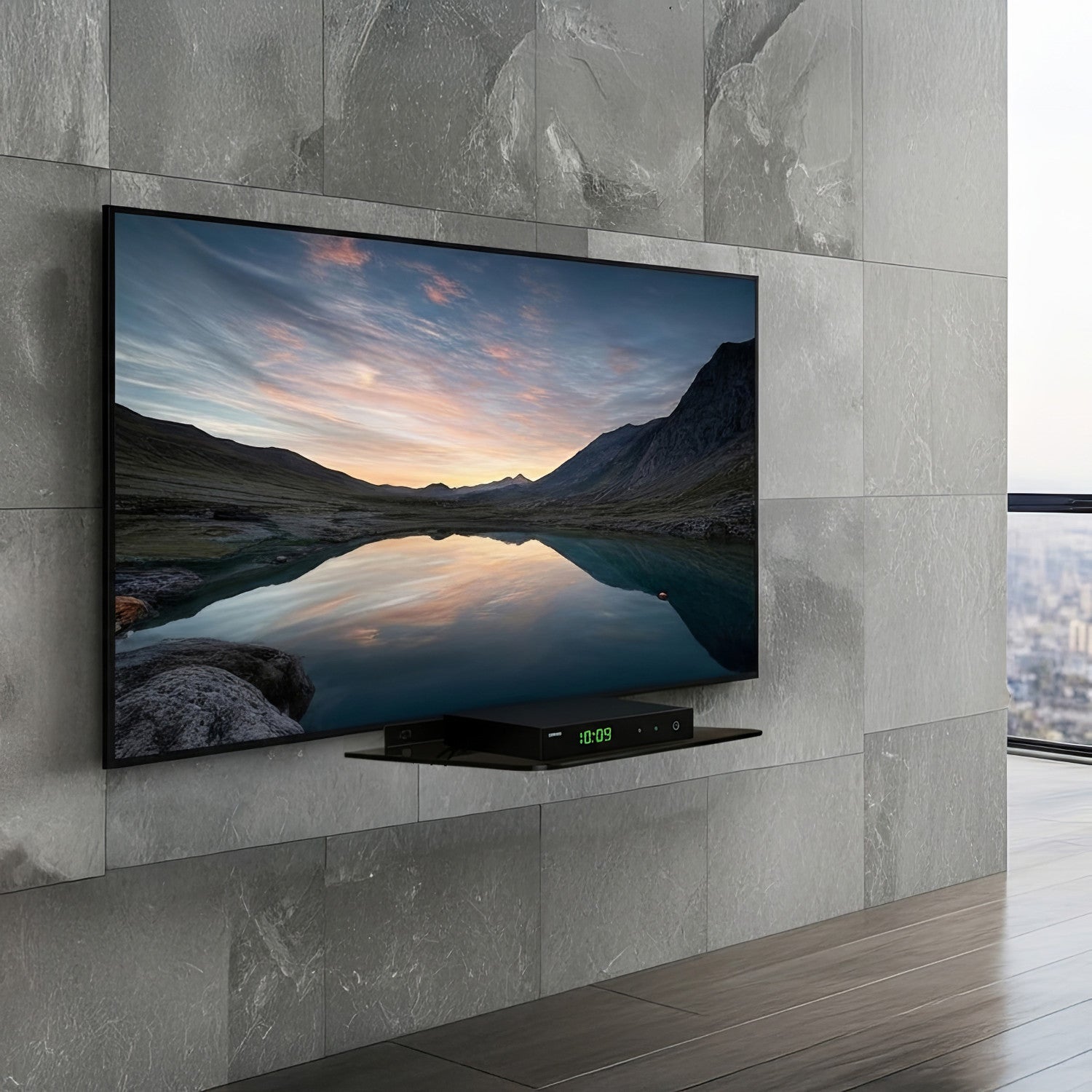 - Economize espaço ao instalar os componentes da sua TV com esta prateleira de parede de vidro preto