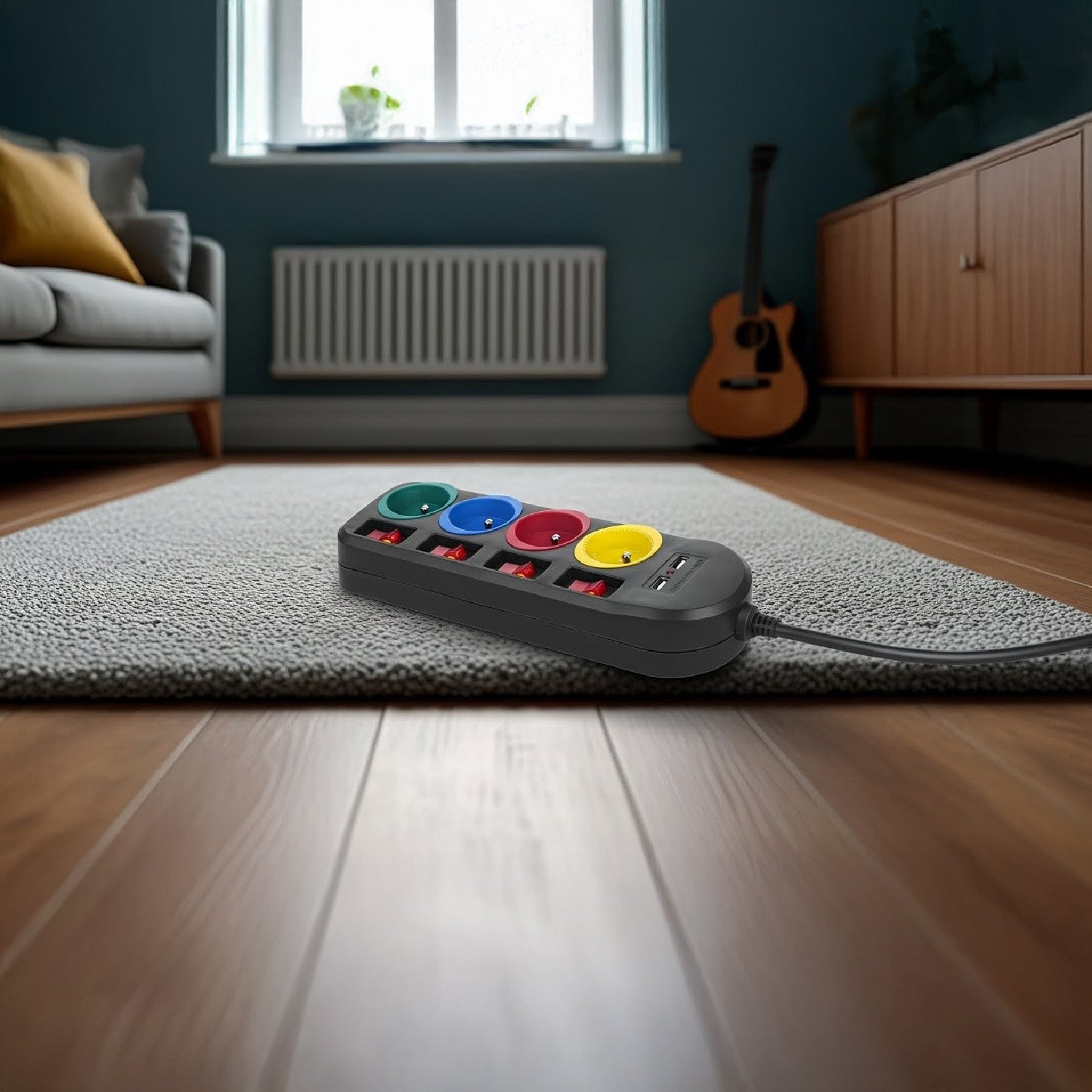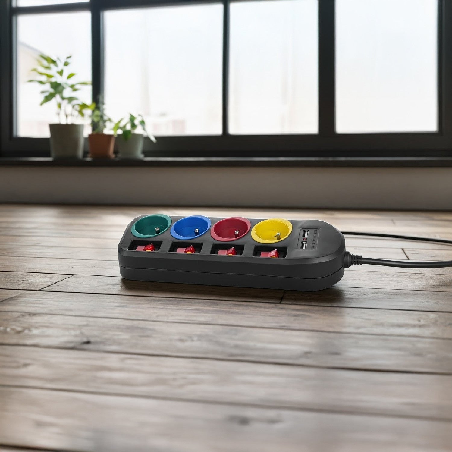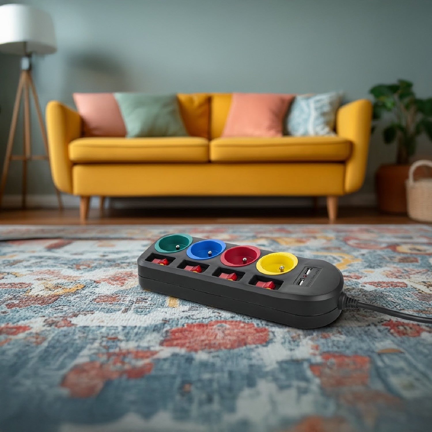 Um filtro de linha com 4 tomadas permite conectar até quatro plugues de tamanho normal simultaneamente. Está equipado com proteção infantil, interruptores independentes para cada tomada e 2 portas USB para carregar dispositivos como smartphones, tablets, câmeras digitais, etc.
