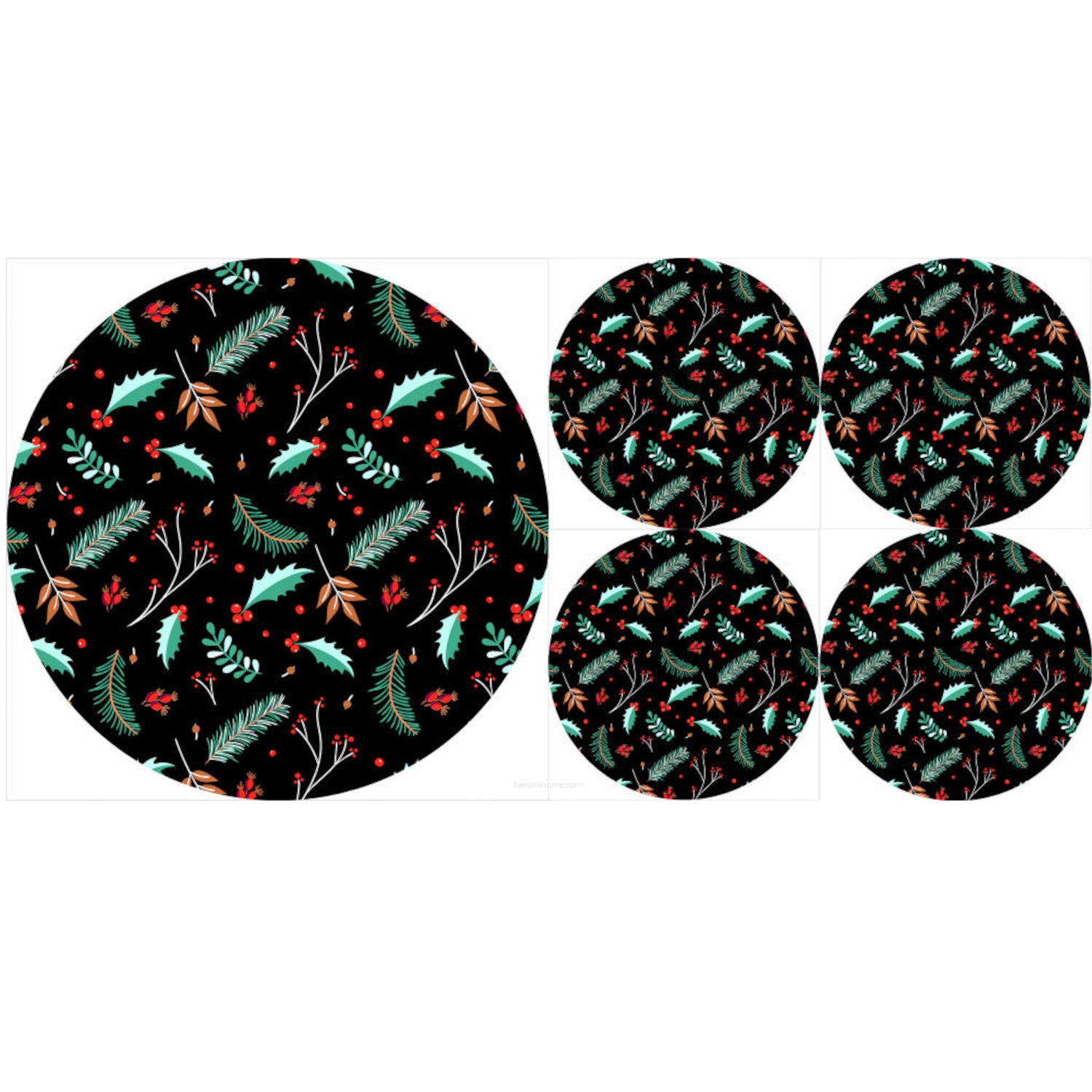 Conjunto de 5 porta-pratos e protetor de mesa em feltro fino de poliéster comprimido. Impressão HD permanente de alta qualidade, lavável até 40 graus.