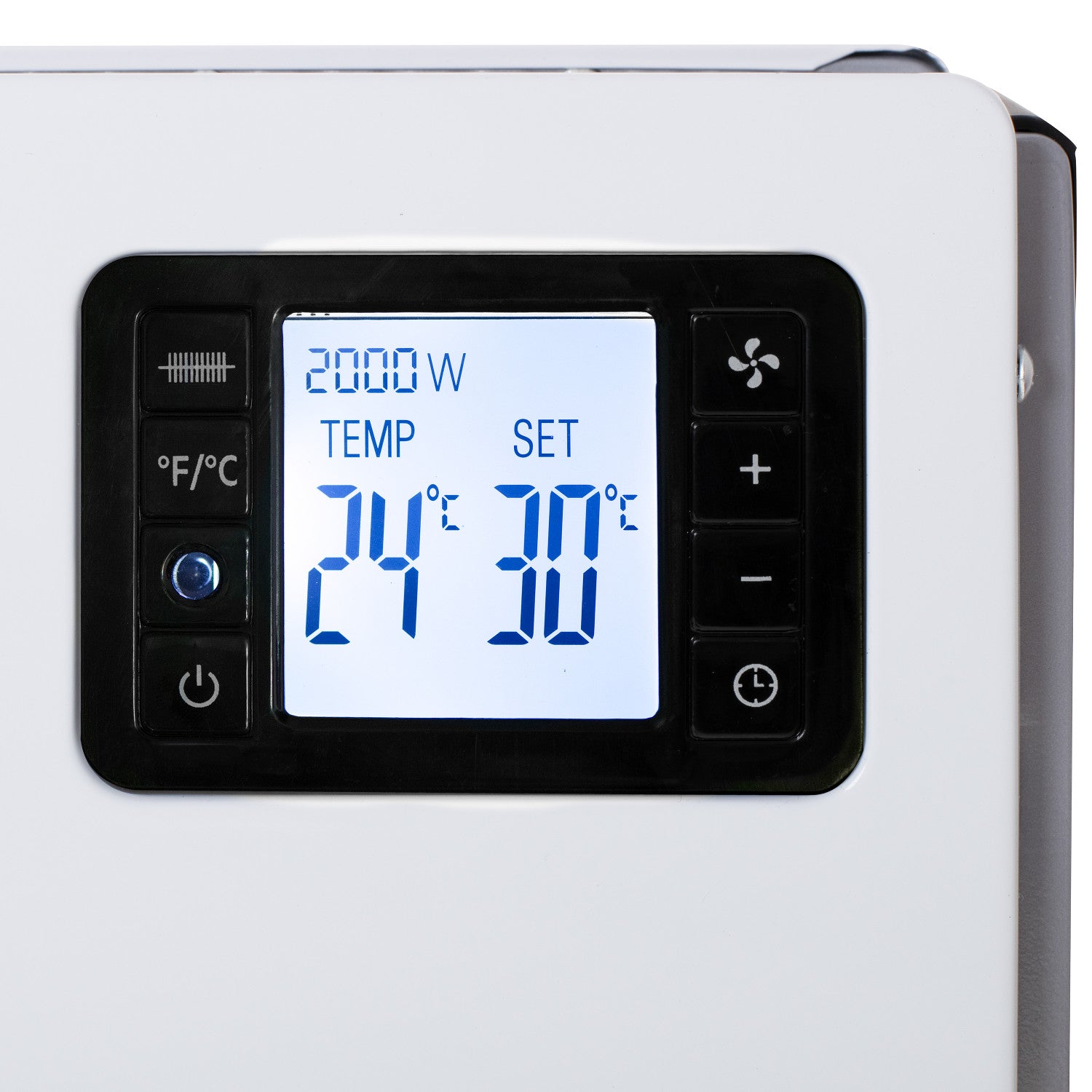 Aparte de que el calefactor por convección queda elegante en interiores, cualquiera puede manejarlo. Hay un panel de control LCD en la unidad, en una posición destacada, donde se pueden leer los ajustes actuales, y se incluye un mando a distancia para que pueda ajustarlo incluso a distancia. Además, puede programar un temporizador para cuando quiera ponerlo en marcha. Puede seleccionar uno de los tres niveles de calefacción de la unidad (750 W/1250 W/2000 W) y ajustar el termostato usted mismo.